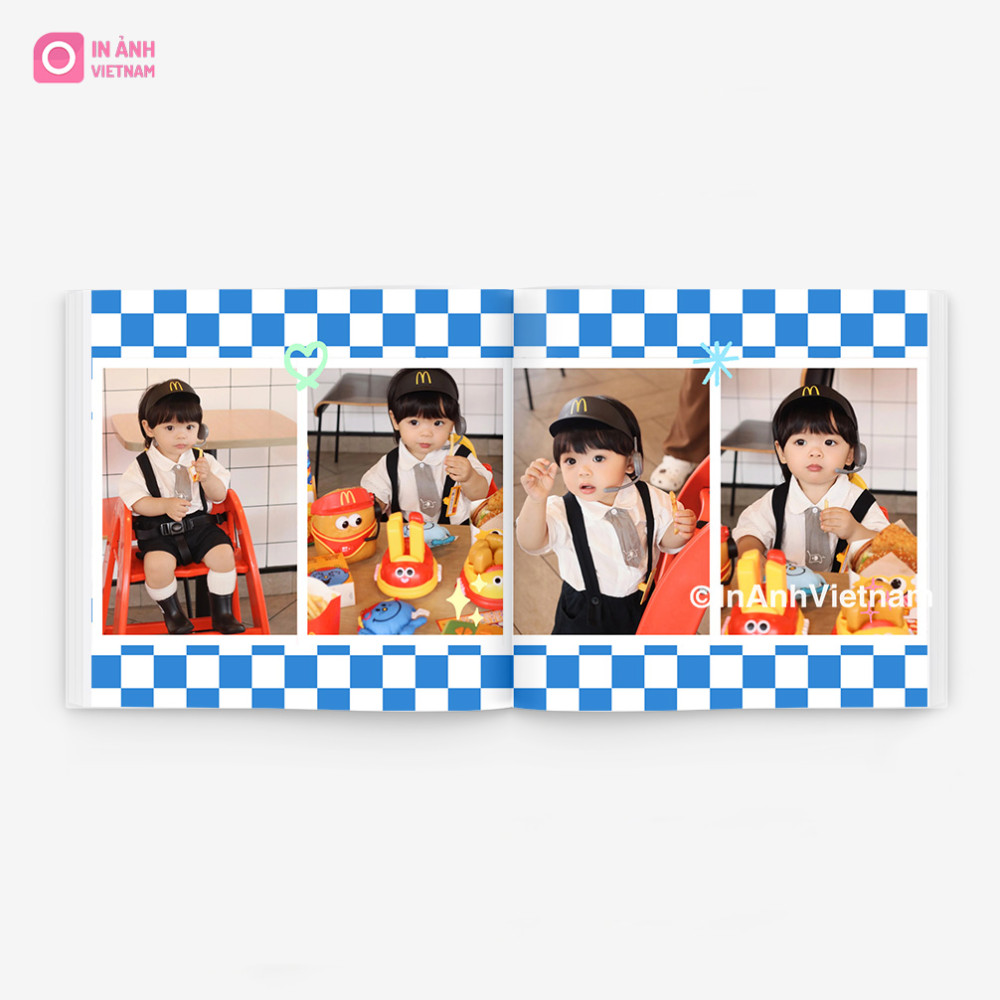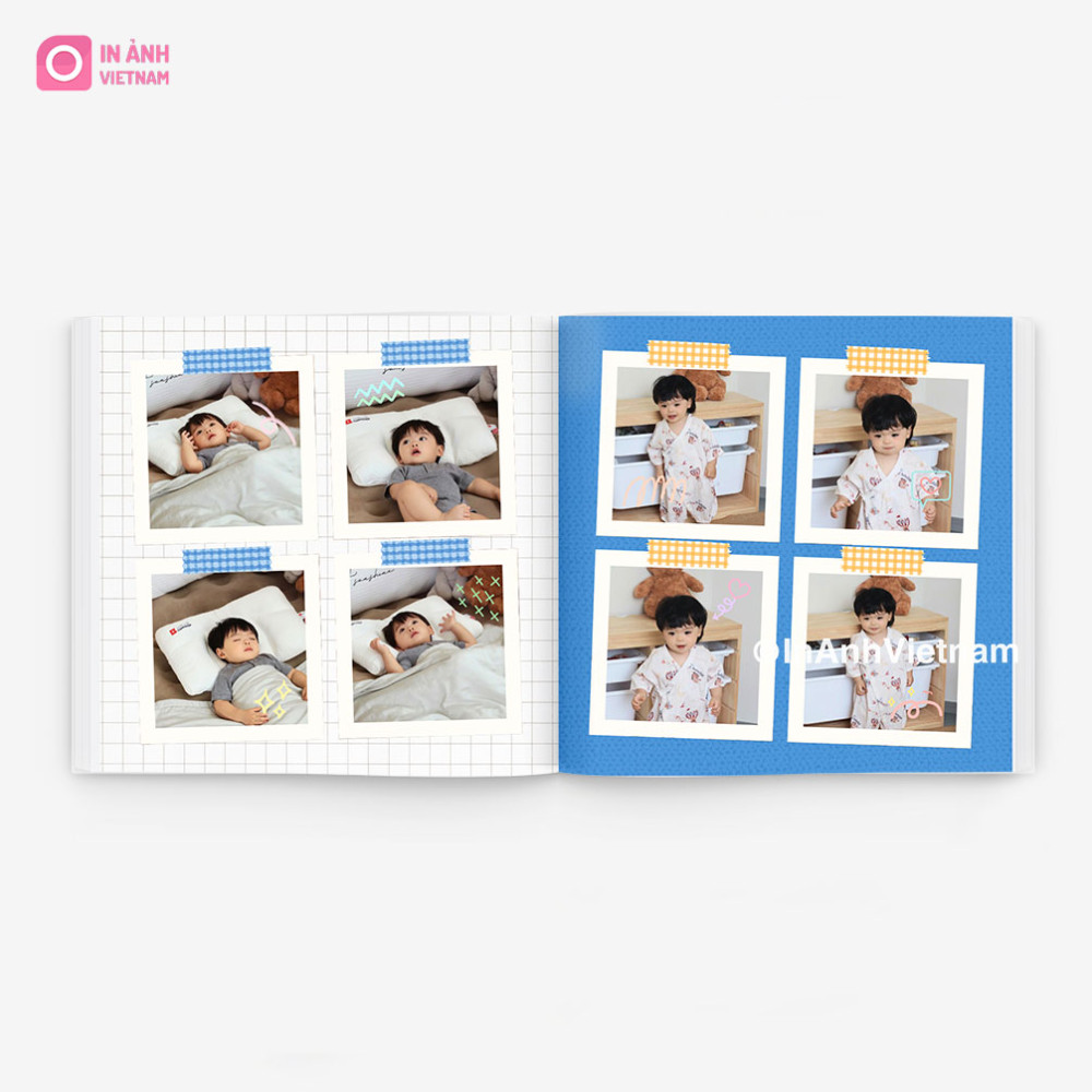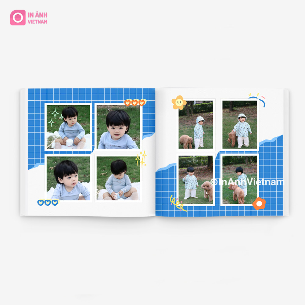 • Bố cục đa khung sáng tạo: Mỗi trang sử dụng khung ảnh vuông hoặc tổ hợp nhiều khung nhỏ – tối ưu số lượng ảnh, giúp thể hiện đầy đủ biểu cảm và hành động đa dạng của bé.
