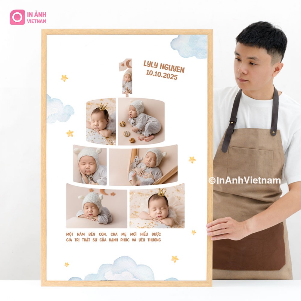 Khung ảnh bánh sinh nhật bé từ In Ảnh Việt Nam, thiết kế sáng tạo lấy cảm hứng từ bánh sinh nhật, lưu giữ khoảnh khắc đáng nhớ của bé yêu. Quà tặng ý nghĩa, trang trí tiệc sinh nhật.